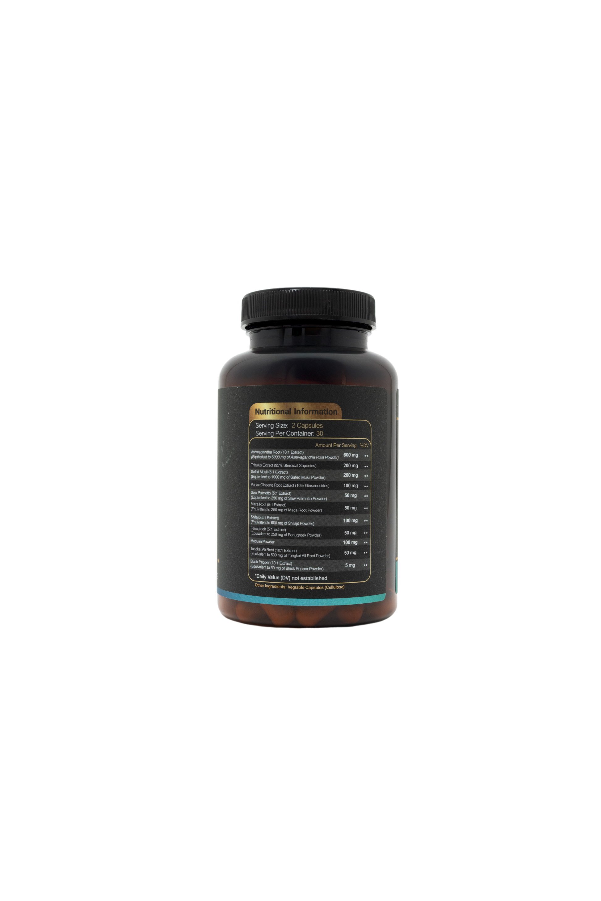 Formulated with Ashwagandha Root (6000mg), Tribulus Extract (200mg), Safed Musli (1000mg), Panax Ginseng (100mg), Saw Palmetto (250mg), Maca Root (250mg), Shilajit (500mg), Mucuna Powder (100mg), Tongkat Ali Root (500mg), Black Pepper Extract (50mg), Fenugreek (250mg)